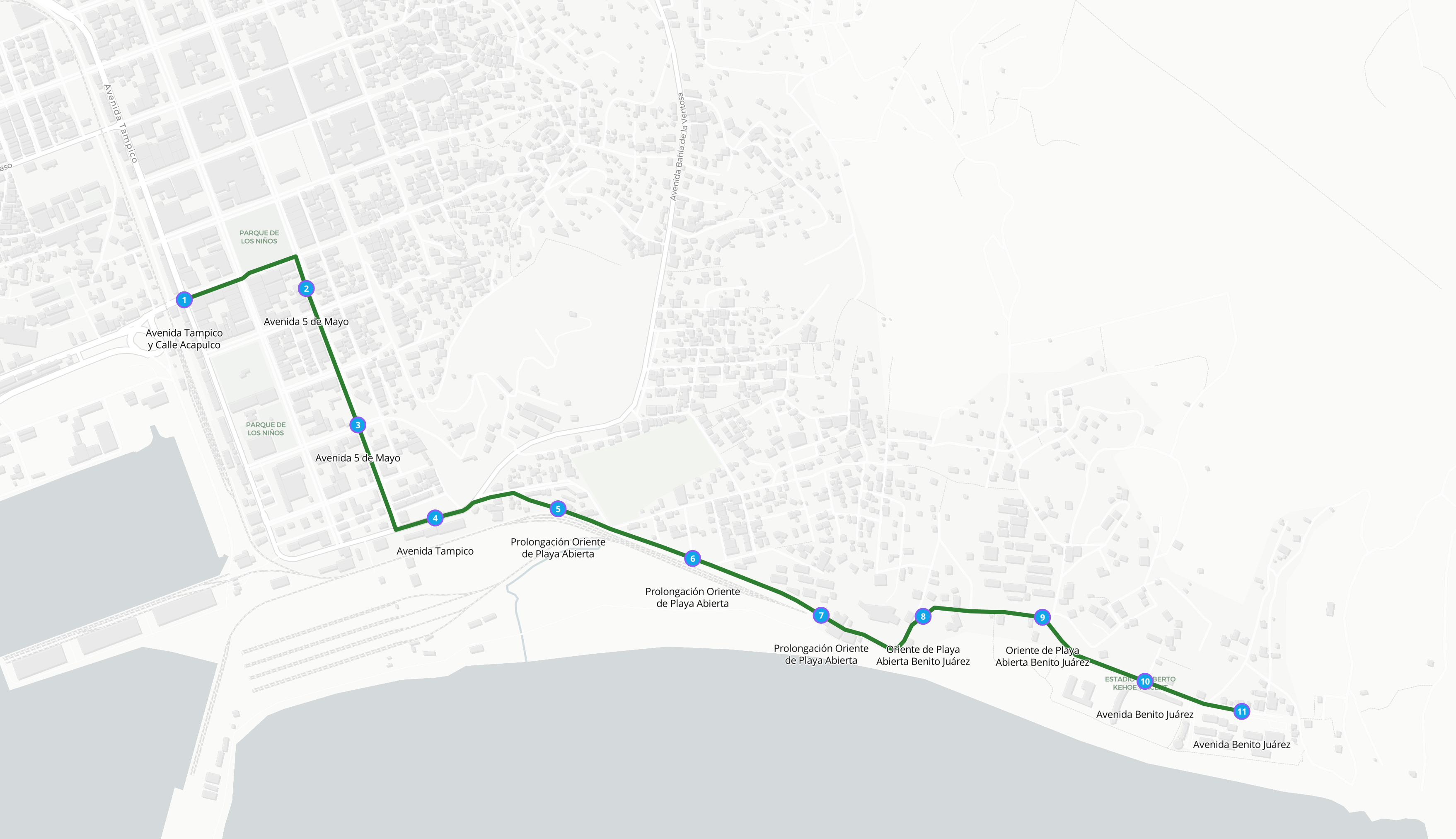 - Geometría: Es una secuencia ordenada de puntos. En el caso de vehículos como autobuses representa el recorrido a través de calles, avenidas y carreteras, de una ruta de transporte. En el caso de transporte subterráneo o un tren, representa el recorrido por vías. En el caso de cablebús o ferrys, representa el recorrido por el aire por agua.