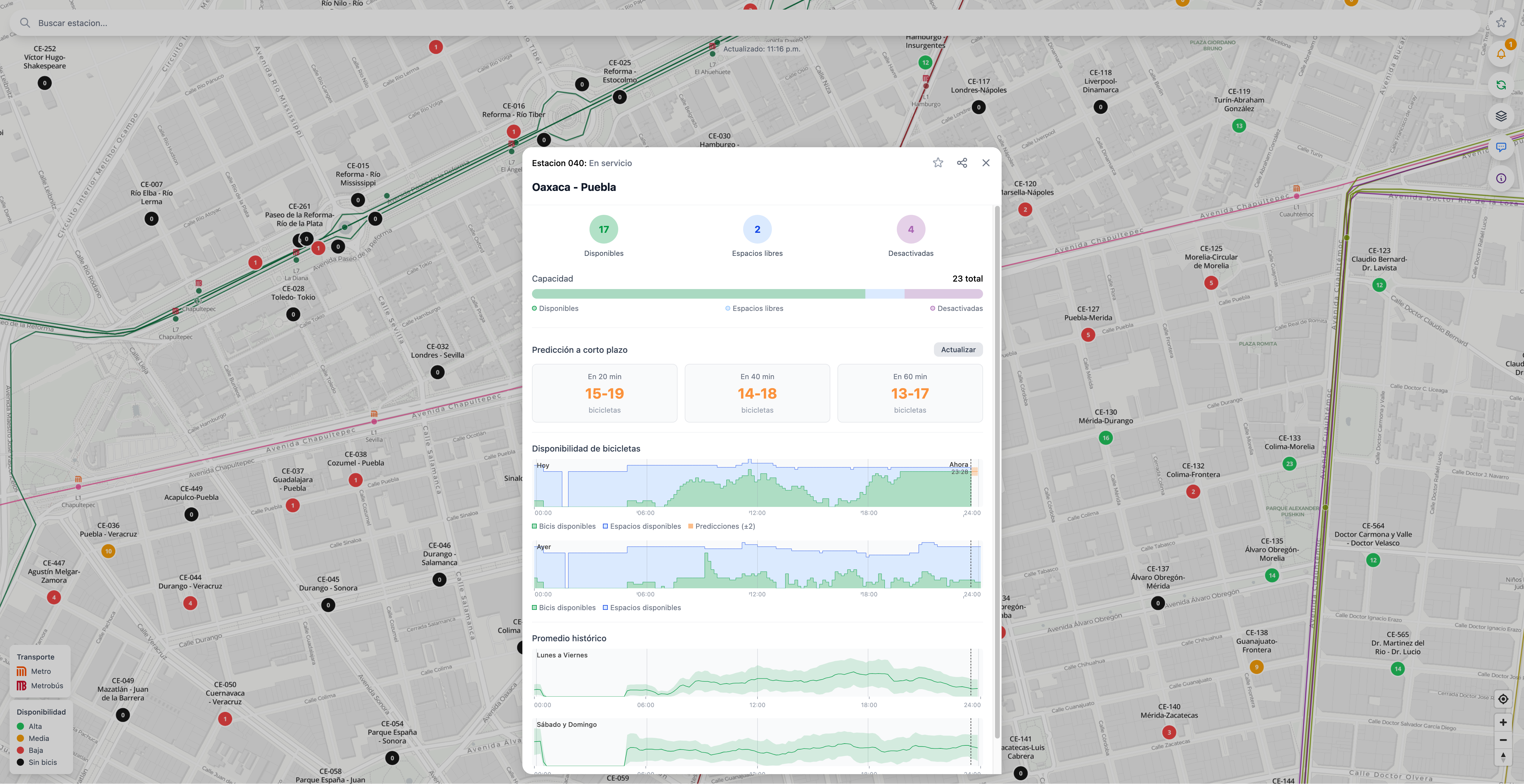 Una de sus funciones centrales es el acceso al historial de cada estación, que permite explorar los patrones históricos. Esto va más allá de la consulta puntual: ofrece la posibilidad de conocer mejor la red, identificar qué estaciones tienden a vaciarse en horarios pico o cuáles mantienen disponibilidad constante. A partir de esos patrones, la plataforma también genera estimaciones sobre la disponibilidad esperada en el corto plazo —20, 40 y 60 minutos—, con un margen de probabilidad realista. Además, integra una capa con las líneas y estaciones del Sistema de Movilidad Integrada —Metro, Metrobús y otras redes— para que la consulta no se dé de forma aislada, sino dentro del contexto más amplio de la movilidad urbana.